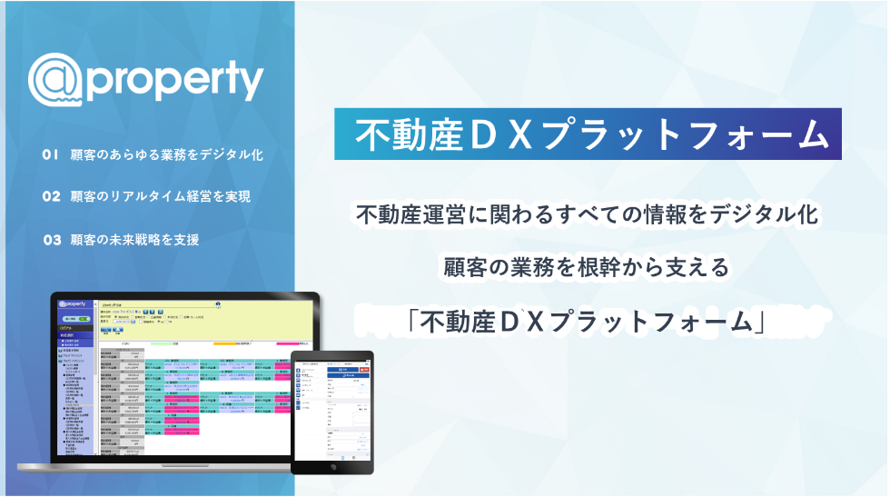 弊社が提供している不動産DXプラットフォーム「@property」は、不動産管理業務におけるあらゆる情報を一元管理し、リアルタイム不動産経営を実現する不動産管理クラウド型ERPです。