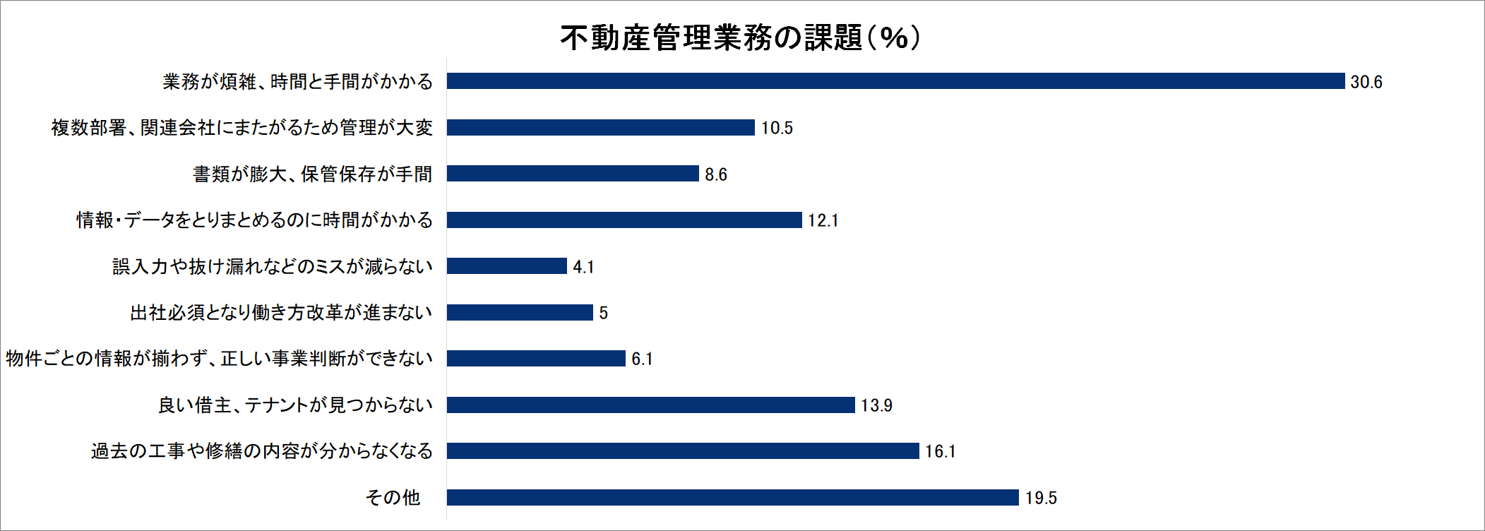 - 不動産管理における課題は「業務が煩雑、時間と手間がかかる」が最多。「過去の工事や修繕の内容が分からなくなる」「複数部署、関連会社にまたがるため管理が大変」などの回答も多く、情報管理や業務効率の必要性が高い状況が見える。