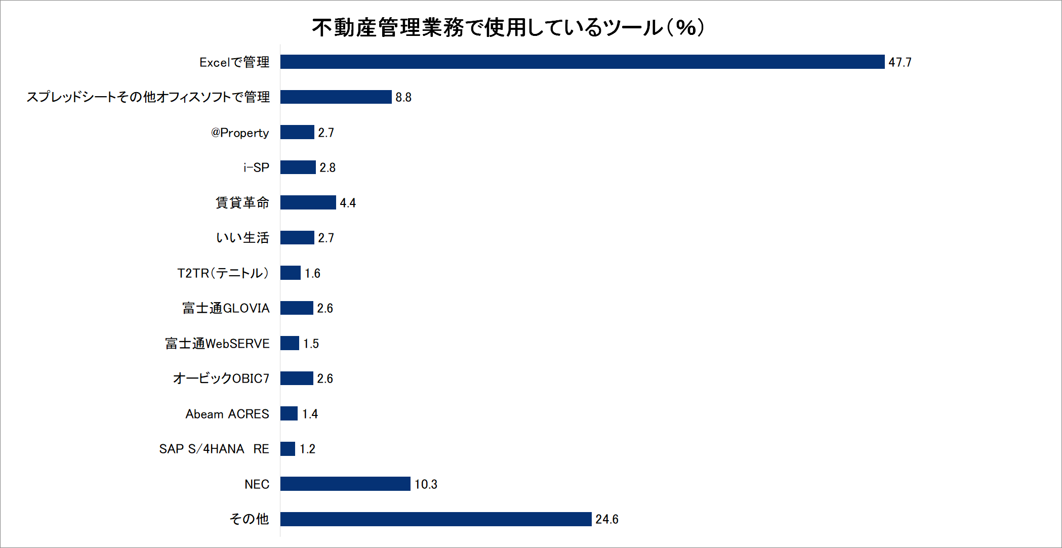 不動産管理業務において、最も使用されているのは「Excel」(47.7%)。管理不動産の目的や棟数により、何のツールを使うかは細分化する傾向。