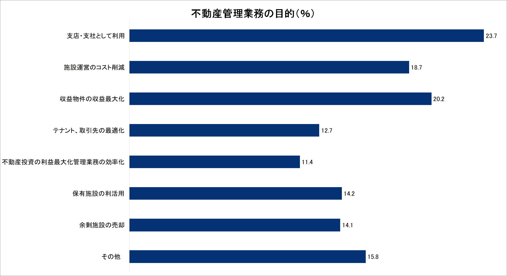 不動産管理業務の目的は、「支店・支社として利用」(23.7%)が最も多く、次いで「収