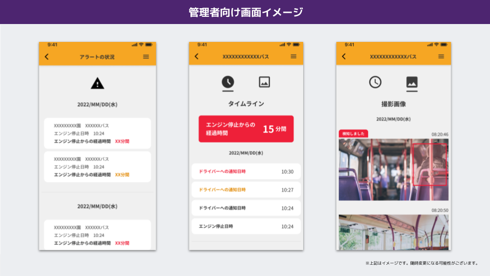 またアラームを止めた後もタブレットを活用し車内の画像を解析し続け、一定時間経過後にも人が確認された場合は管理者に通知が届くようになっています。これにより人の目とテクノロジー(AIやカメラ)のダブルチェックが実現でき、置き去りリスクのさらなる低減が期待できます。またドライバーだけでなく園内の管理者なども車内の映像を確認できるようになっているため、個人に依存せず組織の力で置き去りの抑制を目指します。