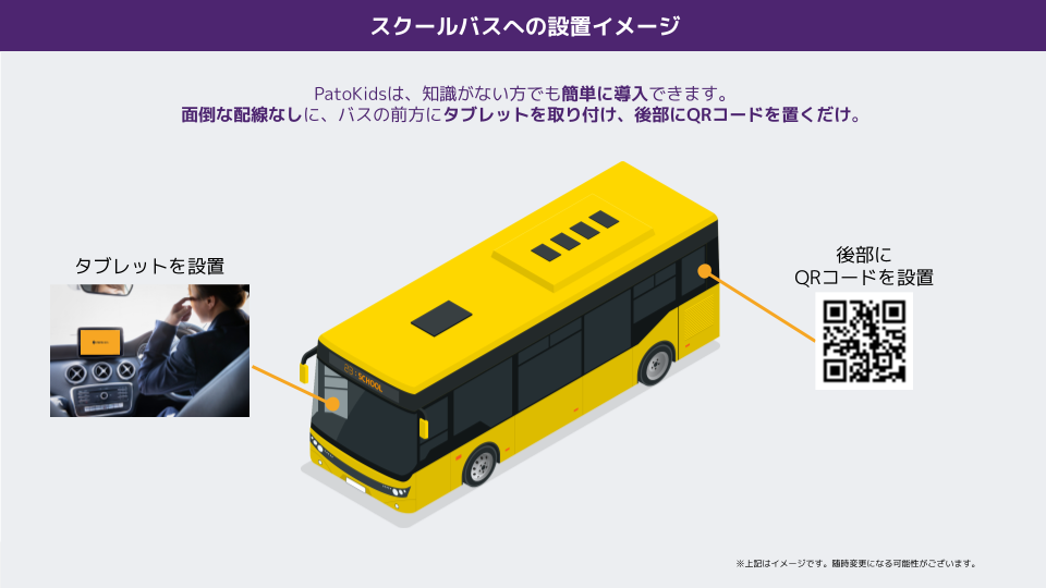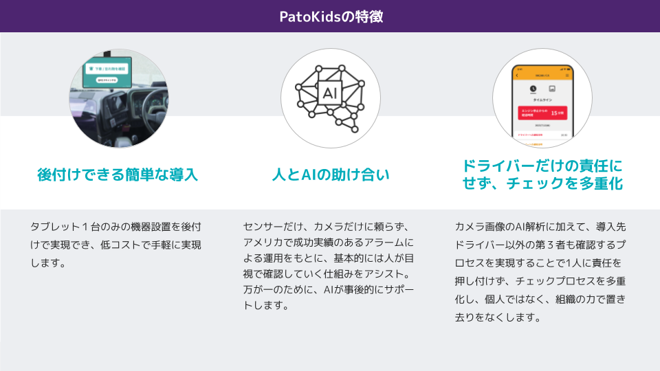 バスの車内に設置したタブレットとAIを用いた画像解析を組み合わせることで、人の注意力に依存せずに置き去りを未然に防ぎます。これにより、日常業務に極力負担をかけずに、テクノロジーを用いて子供の安全をサポートすることを目指します。