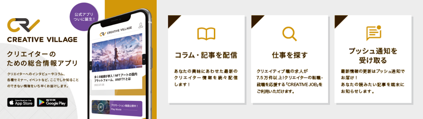 公式アプリでは、ご自身の興味・関心を登録することができ、ニュースや求人、イベント情報など、よりパーソナライズされた情報を受け取ることが可能です。また、サイトリニューアルとアプリのリリースにあわせて、「CREATIVE VILLAGE」のイメージムービーも公開しております。CREATIVE VILLAGE編集部は今後も、コンテンツのさらなる拡充を図るとともに、クリエイターの方々の夢の実現をサポートする総合情報サイトとして、専門性・速報性・信頼性の高い情報発信に努めてまいります。