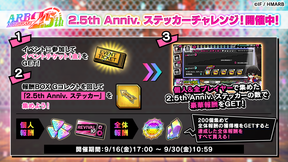 「イベントチケット(金)」を使って2.5th ANNIVERSARY 報酬BOX Gコレクトを回し、「2.5th Anniv. ステッカー」を集めることで豪華報酬をGETできるキャンペーンを実施いたします。個人報酬の他に、条件を満たした全プレイヤーが獲得できる全体報酬もございます。ぜひ奮ってご参加ください。