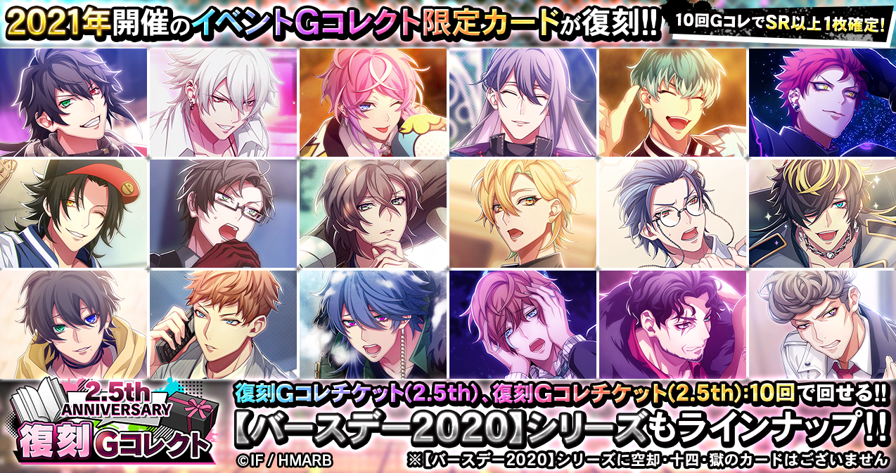 2.5th ANNIVERSARYを記念し、6ディビジョン全18キャラクターの描きおろしカード【Break down!】シリーズが手に入るGコレクトを開催します。ディビジョン別に6つのGコレクトが登場し、Gコレクトチケット、Gコレクトチケット:10回またはジェムで回すことができます。