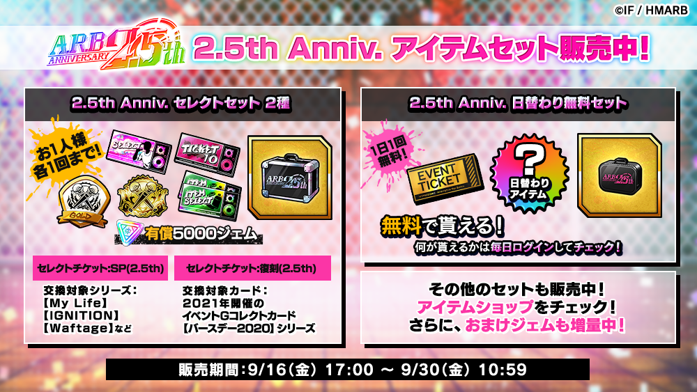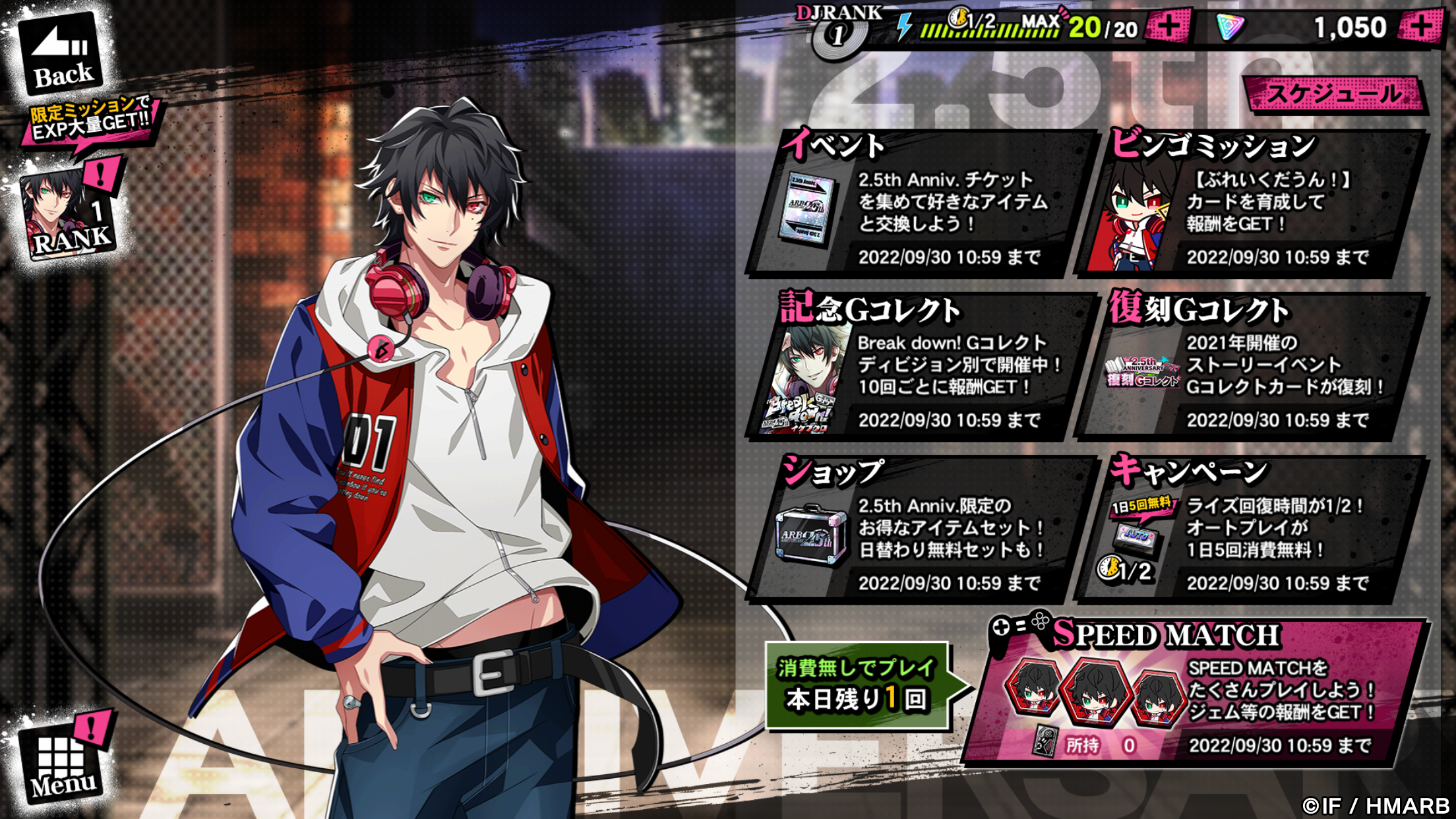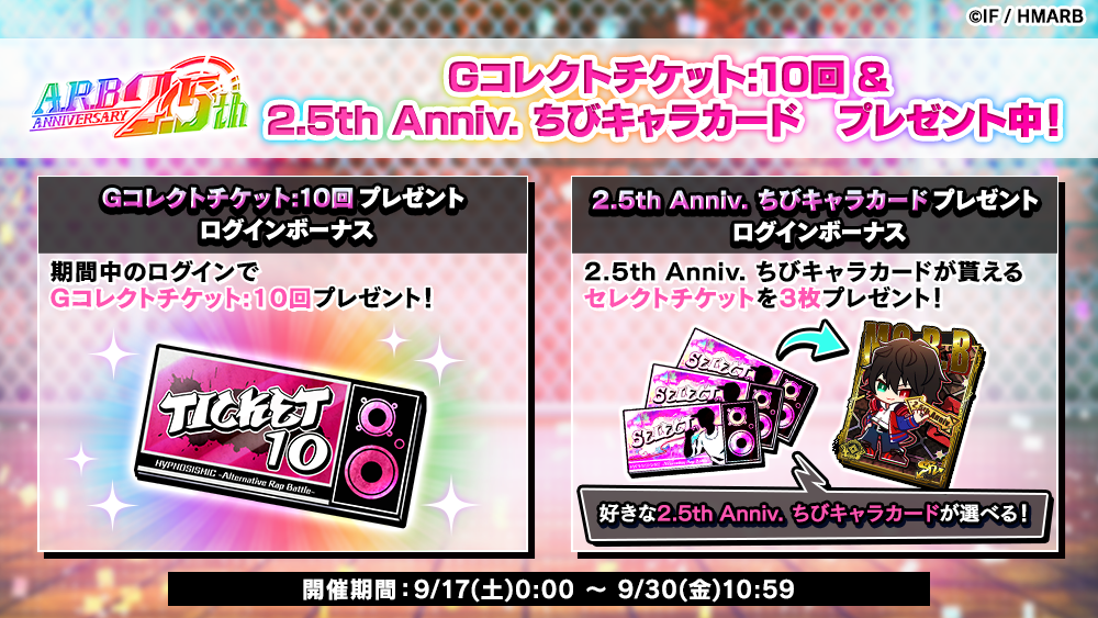 ゲームアプリ内では期間中、2.5th ANNIVERSARYを記念した特設ページが登場!イベント「2.5th ANNIVERSARY」開催のほか、新登場したMINI GAME「SPEED MATCH」やログインボーナス、限定ミッションの実施など、ヒプマイ -A.R.B-をより一層楽しんでいただくための特別なキャンペーンを行っております。