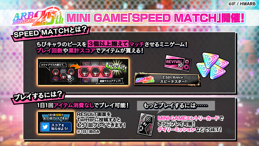 ちびキャラのピースを3個以上揃えてマッチさせるMINI GAME「SPEED MATCH」が期間限定で登場しました。1日1回アイテム消費なしでプレイできるほか、RESULT画面をTwitterに投稿することでもう1回アイテム消費なしでプレイすることが可能です。また、デイリーミッションやイベントアイテム交換などで入手できる「MINI GAMEエントリーカード」を使用することでもプレイでき、プレイ回数や累計スコアに応じてアイテムが獲得できます。