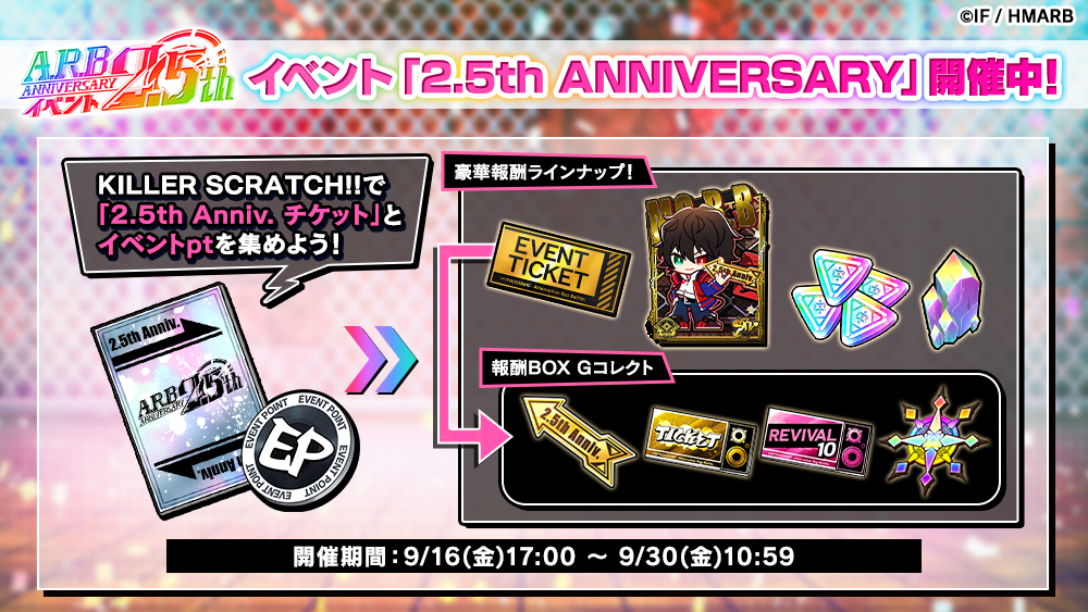 KILLER SCRATCH!!をプレイして「2.5th Anniv. チケット」とイベントptを集めることで、描きおろしの限定ちびキャラのSRカード【ぶれいくだうん!】シリーズ、過去のイベントGコレクト限定SSRカードが当たるGコレクトが回せる「復刻Gコレチケット(2.5th):10回」や「スキルスターマテリアル:SSR」など豪華報酬を獲得することができます。