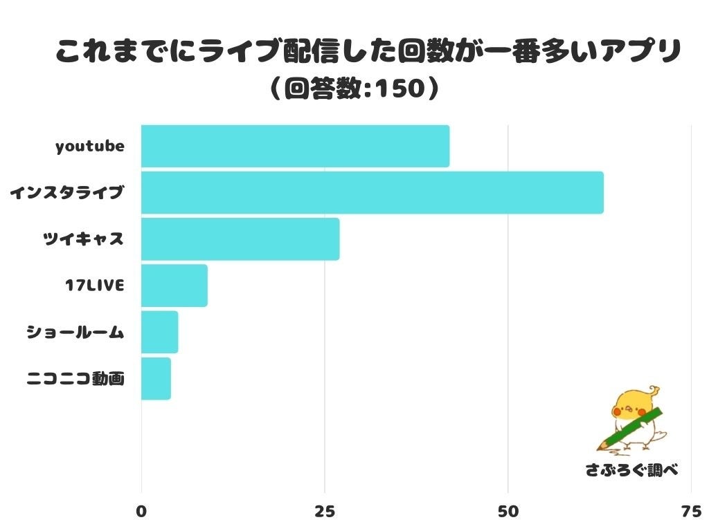 これまでにライブ配信した回数が一番多いアプリをアンケートにて調査したところ、1位は「インスタライブ」でした。