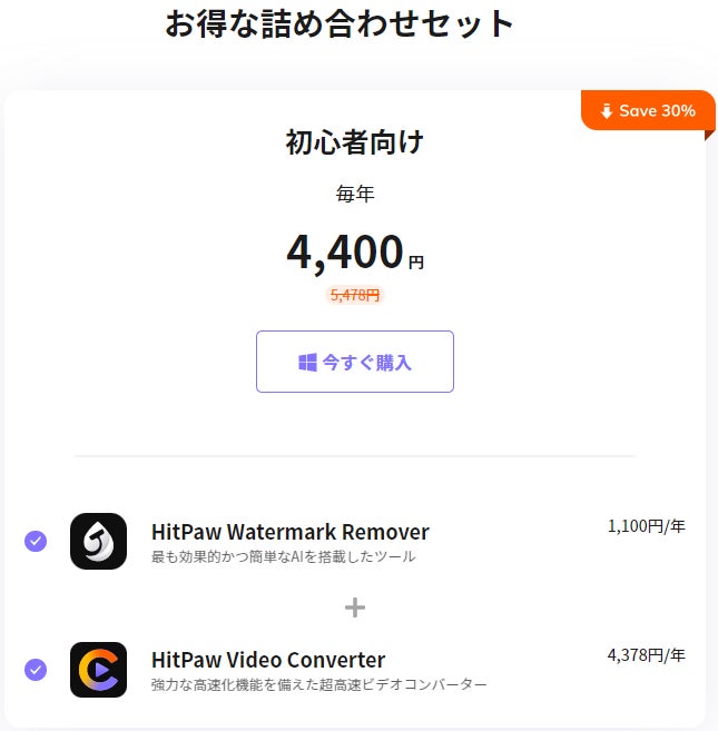 HitPaw Watermark Remover – 1 Year/1 PC + HitPaw Video Converter – 1 Year/1 PC =1100+4378=4,400(オリジナル価格5,478)
