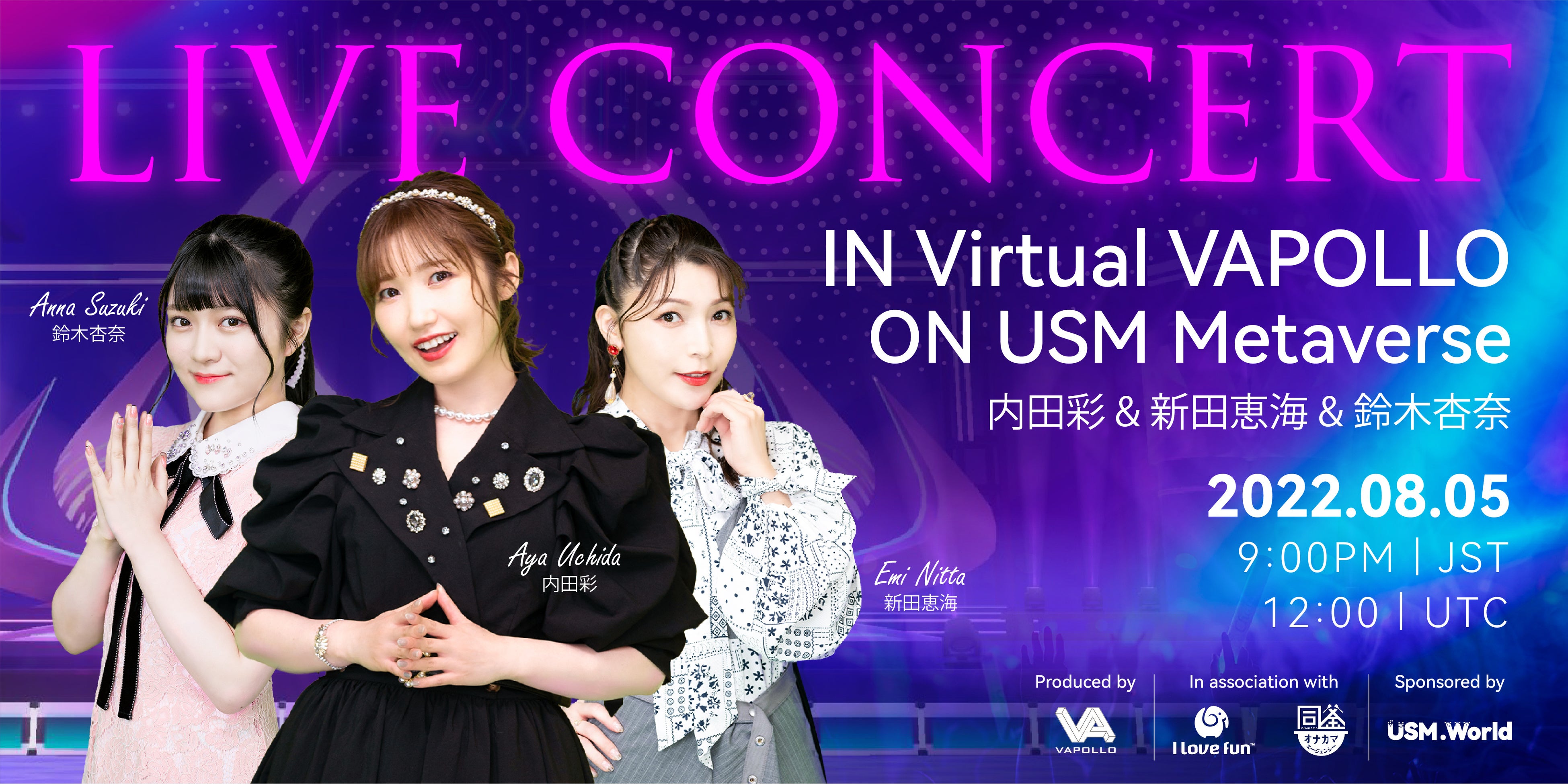 内田彩、新田恵海、鈴木杏奈の3名の人気声優が、初めてのメタバースライブを「Virtual VAPOLLO」上で開催。会場を縦横無尽に動き回るたくさんの3Dアバターの観客や、飛び交うNFTアイテムの中で、Web3時代の新たなライブに挑戦。