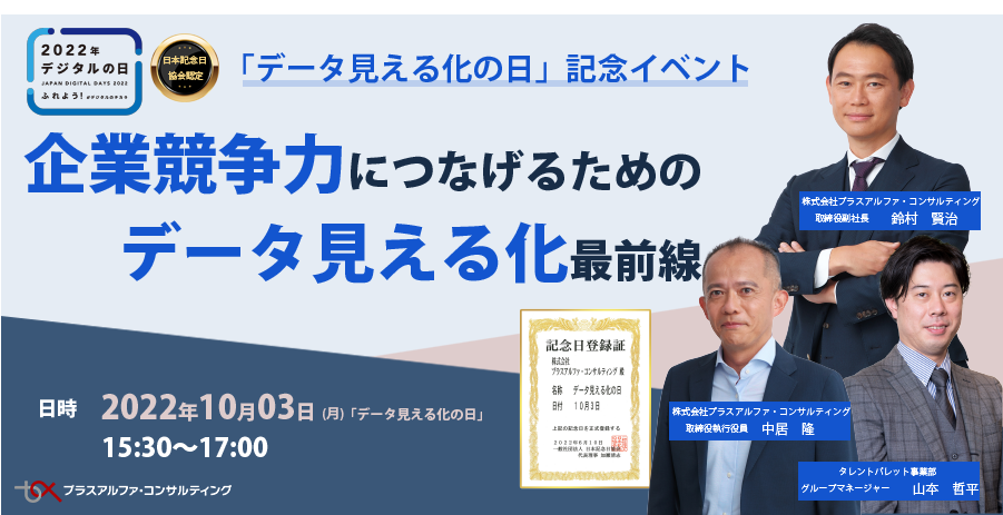 プラスアルファ・コンサルディングでは、データ見える化やその活用に関心を持ってもらい、データを見える化する技術の進歩を後押しすることを目的として、10月3日を「データ見える化の日」として一般社団法人日本記念日協会に申請し、認定されました。