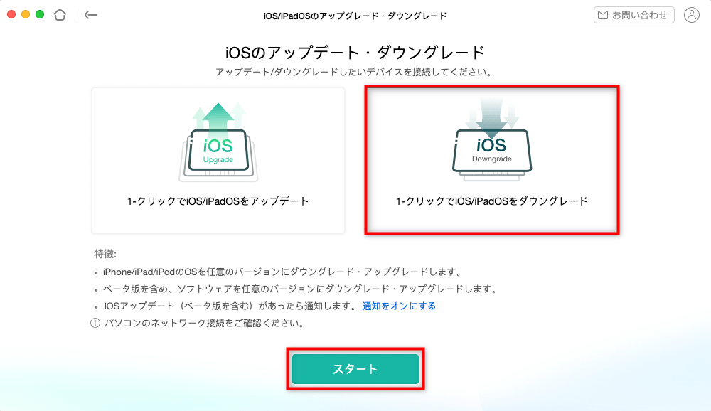 Step 3.「1-クリックでiOS/iPadをダウングレード」モードを選択して、「スタート」ボタンをクリック