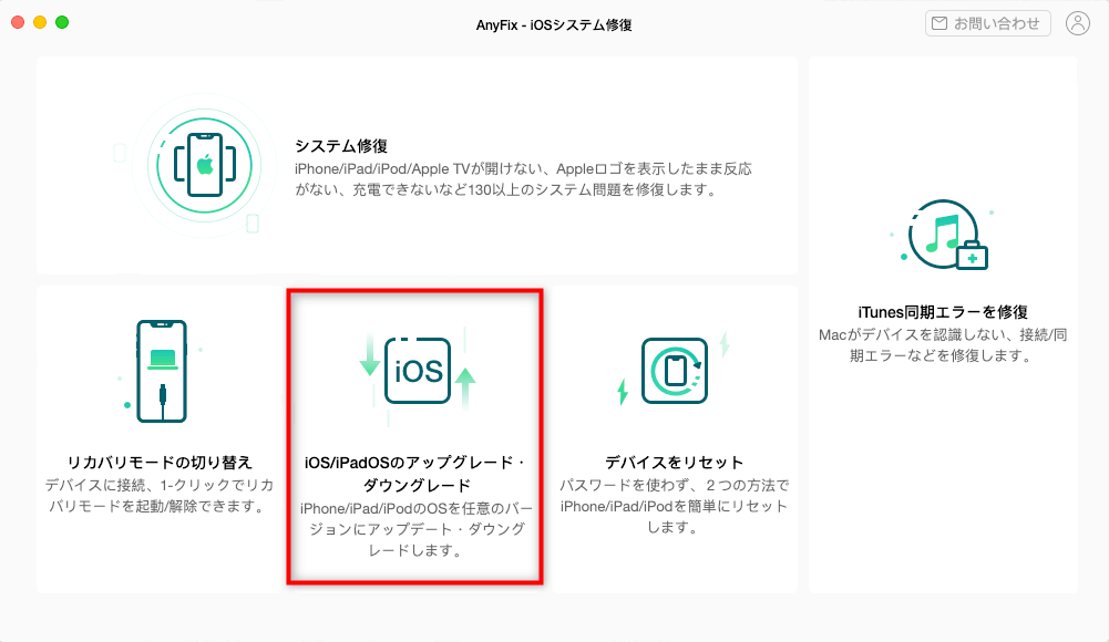 Step 2.「iOS/iPadOSアップグレード/ダウングレード」をクリックします。