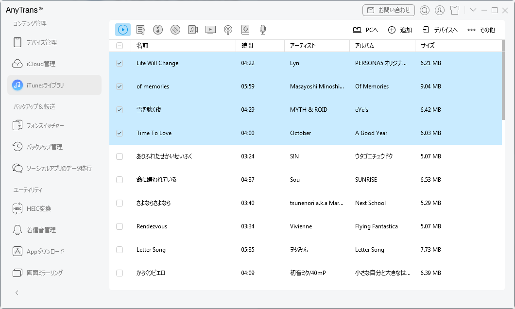 AnyTransはiTunesの代わりに、iTunes・CD・PCの曲をiPhoneに同期できます。iPhoneに既存の音楽を削除されません。