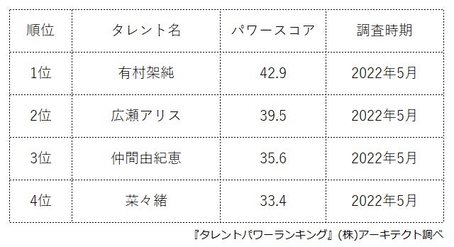 本ランキングは、2022年5月度に実施したタレント調査データ(一部過去実施データ)を利用し、タイトルに応じてランキング形式でまとめたものです。