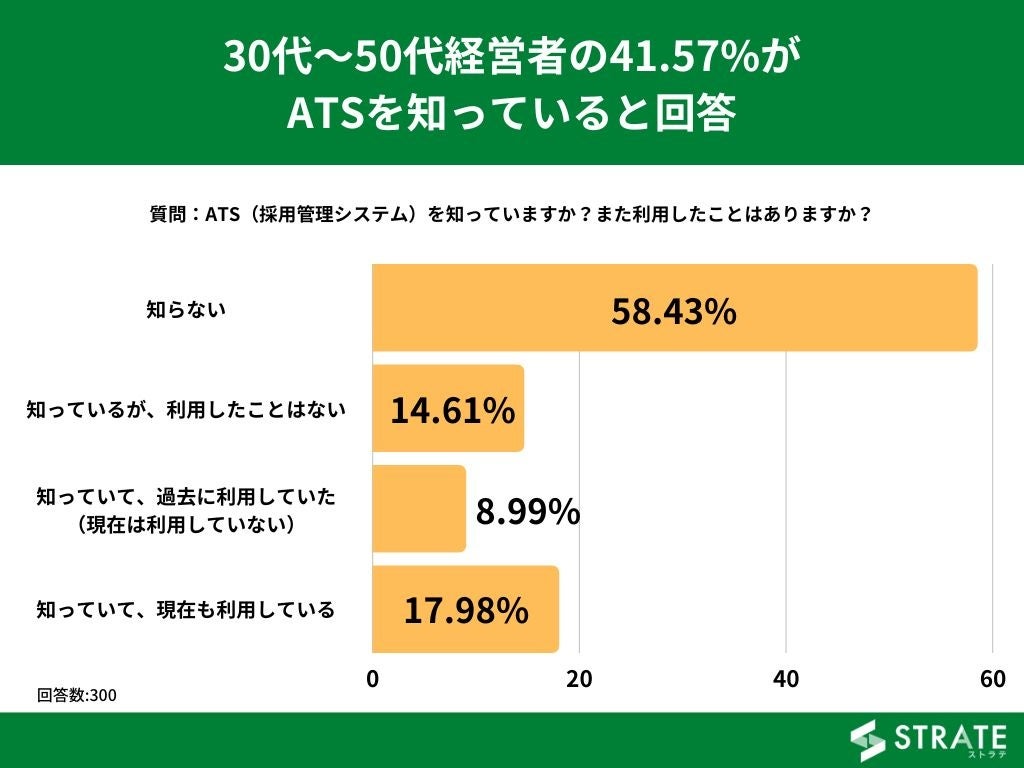 30代~50代の男女を対象とした「ATS(採用管理システム)を知っていますか?また利用したことはありますか?」というアンケートで最も多かった回答は「知らない」で58.43%でした。
