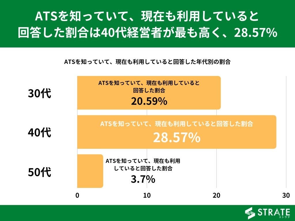 ATSを知っていて、現在も利用していると回答した割合を年代別でみてみますと、40代が28.57%、次いで30代が20.59%、50代は3.7%という結果になりました。