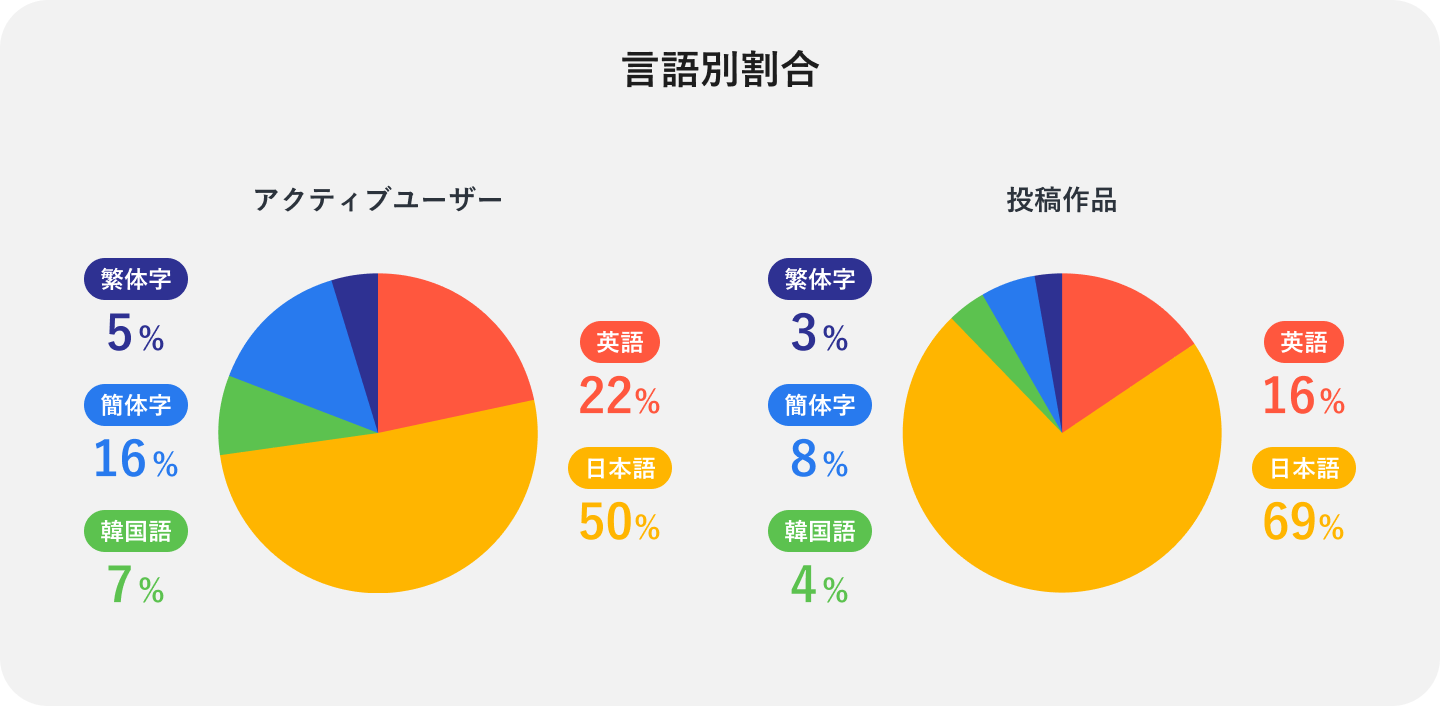 日本を拠点として始まったpixivは、近年、海外からの作品投稿と閲覧が大きく増加しています。日本語以外の言語を使用しているアクティブユーザーは、総ユーザーの50%を超え、海外からの作品投稿は過去最高の月間26万作品にのぼりました。