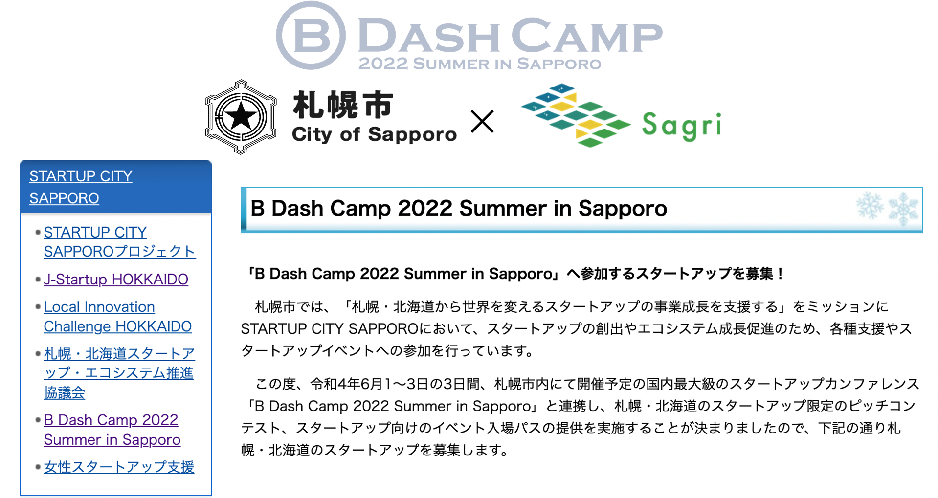 札幌市では、「札幌・北海道から世界を変えるスタートアップの事業成長を支援する」をミッションにSTARTUP CITY SAPPOROにおいて、スタートアップの創出やエコシステム成長促進のため、各種支援やスタートアップイベントへの参加を行っています。この度、令和4年6月1~3日の3日間、札幌市内にて開催予定の国内最大級のスタートアップカンファレンス「B Dash Camp 2022 Summer in Sapporo」と連携し、札幌・北海道のスタートアップ限定のピッチコンテスト、スタートアップ向けのイベント入場パスの提供を実施。サグリは本制度に採択されました。https://www.city.sapporo.jp/keizai/it/startup/bdashcamp2022.html