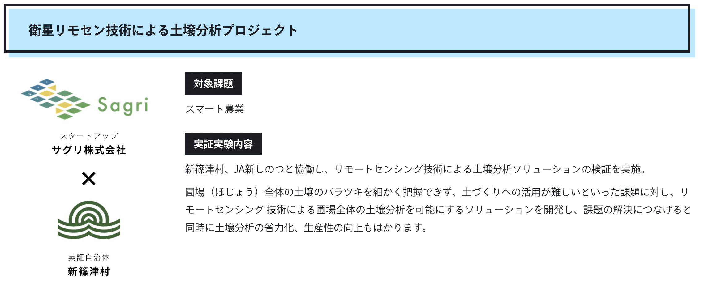 また、札幌市では、「さっぽろ連携中枢都市圏」の11市町村と連携し、圏内の地域・行政課題をスタートアップとの協働により解決を目指す行政オープンイノベーションプロジェクト「Local Innovation Challenge HOKKAIDO」を2020年度より実施しており、サグリは2020年度に採択された企業である。