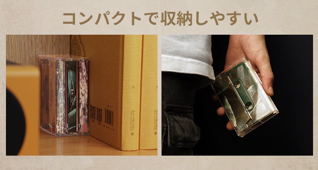 カセットテープ型のデザインを採用。コンパクトで収納しやすく、持ち運びにも便利。