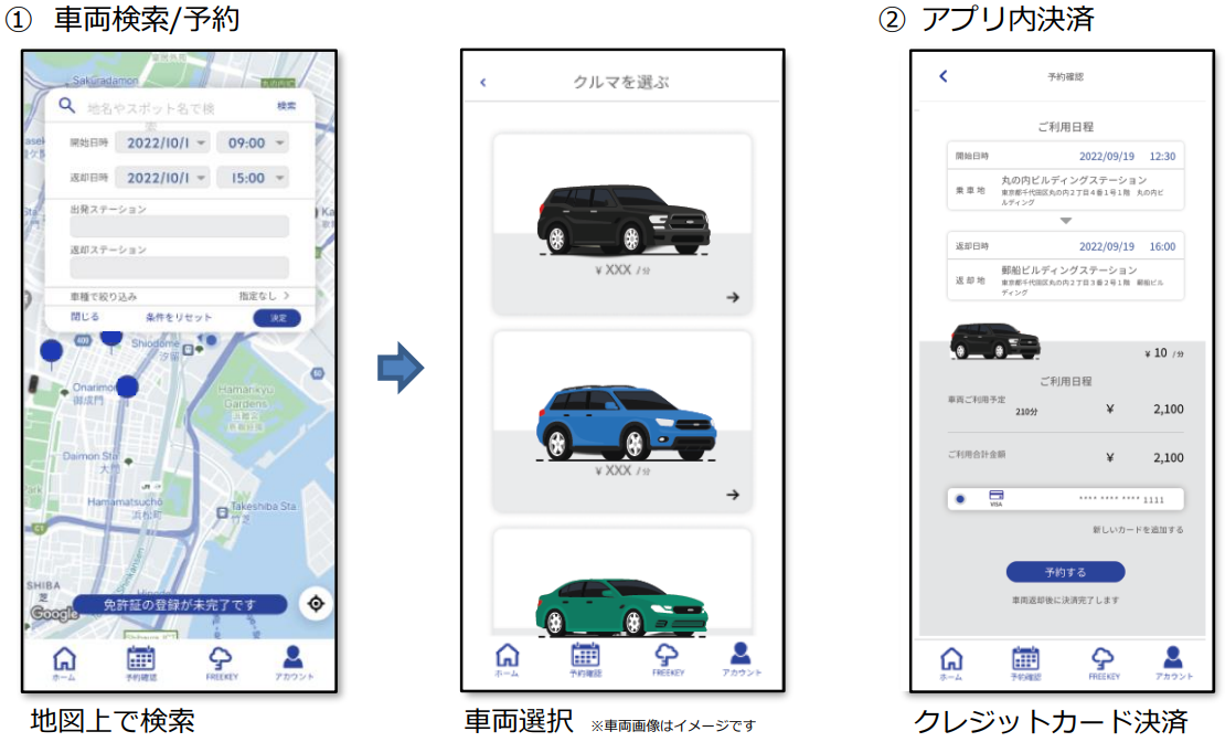 レンタカー事業者が車両情報(料金、保管場所等)をシステムへ事前登録することで、利用者はアプリの地図上から車を検索し、予約可能。