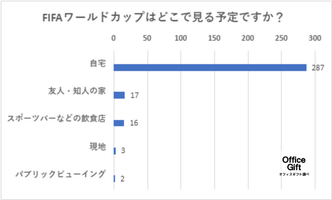 今回、「2022FIFAワールドカップカタール大会はどこで見る予定ですか?」という質問に対して、コロナの影響もあり「自宅」と回答した方が287名と大多数でした。