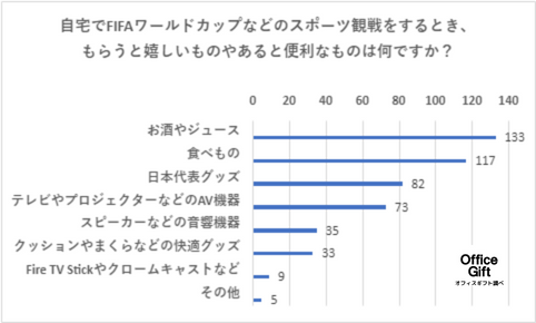 「自宅でFIFAワールドカップなどのスポーツ観戦をするとき、もらうと嬉しいものや、あると便利なものは何ですか?」という質問では、「お酒やジュース」が133名、「食べもの」が117名、「日本代表グッズ」が82名で、「テレビやプロジェクターなどのAV機器」「スピーカーなどの音響機器」「クッションやまくらなどの快適グッズ」「Fire TV Stickやクロームキャストなどのデバイス機器」の順に続く結果となりました。