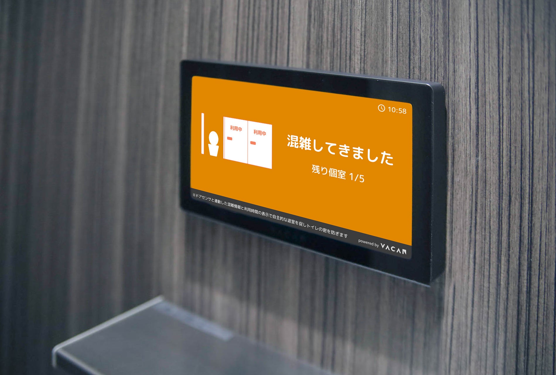 トイレの混雑抑止メディアサービス「AirKnock Ads(https://corp.vacan.com/service/airknock)」は、AIとIoTを活用し取得したトイレのリアルタイムの混雑情報と利用時間を、個室内壁面に設置したモニターに表示することで利用者の自主的な退室を促し、長時間利用を抑制するサービスです。また個室内に設置されたモニターを通して、施設からのお知らせや動画広告などを配信できます。
