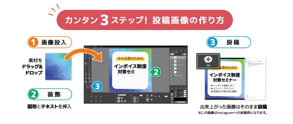 作成した画像をソフト上から直接Facebook、Instagram、Twitterの投稿画面に送ることができます可能です。その場で投稿文を入力するだけですぐに投稿をおこなえます。