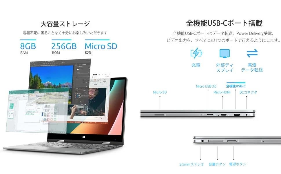 8GBのLPDDR4メモリ、256GBの高速SSD。Office搭載、MicroSDカードで最大512GBのストレージに拡張可能【その他の機能】 720Pフロントカメラ、内蔵マイク、2.4GHz/5GHzデュアルWIFI、Gセンサー、Bluetooth 4.2対応。