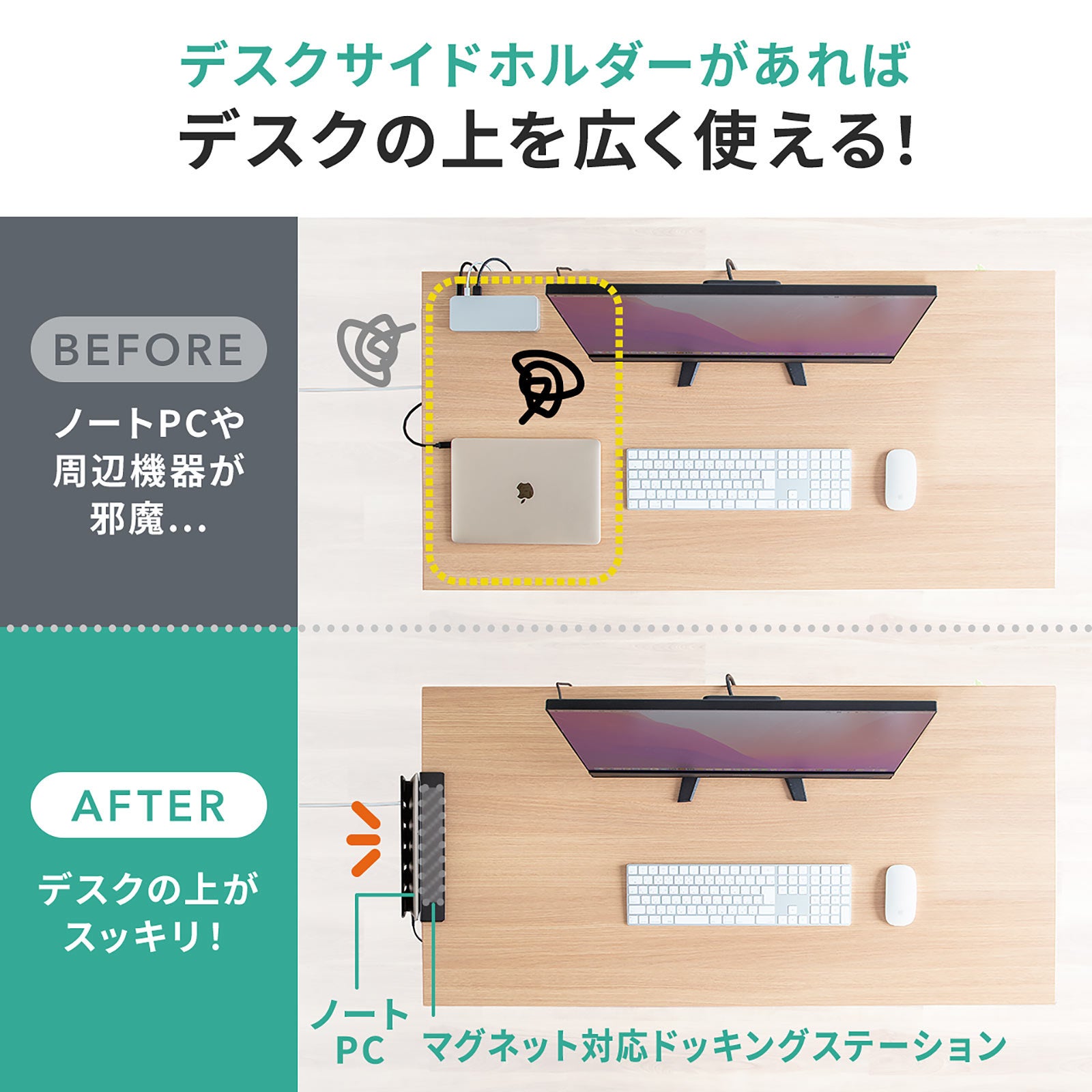 本製品は、デスクの天板に装着することでノートパソコンや書類の収納スペースを作れるホルダーです。