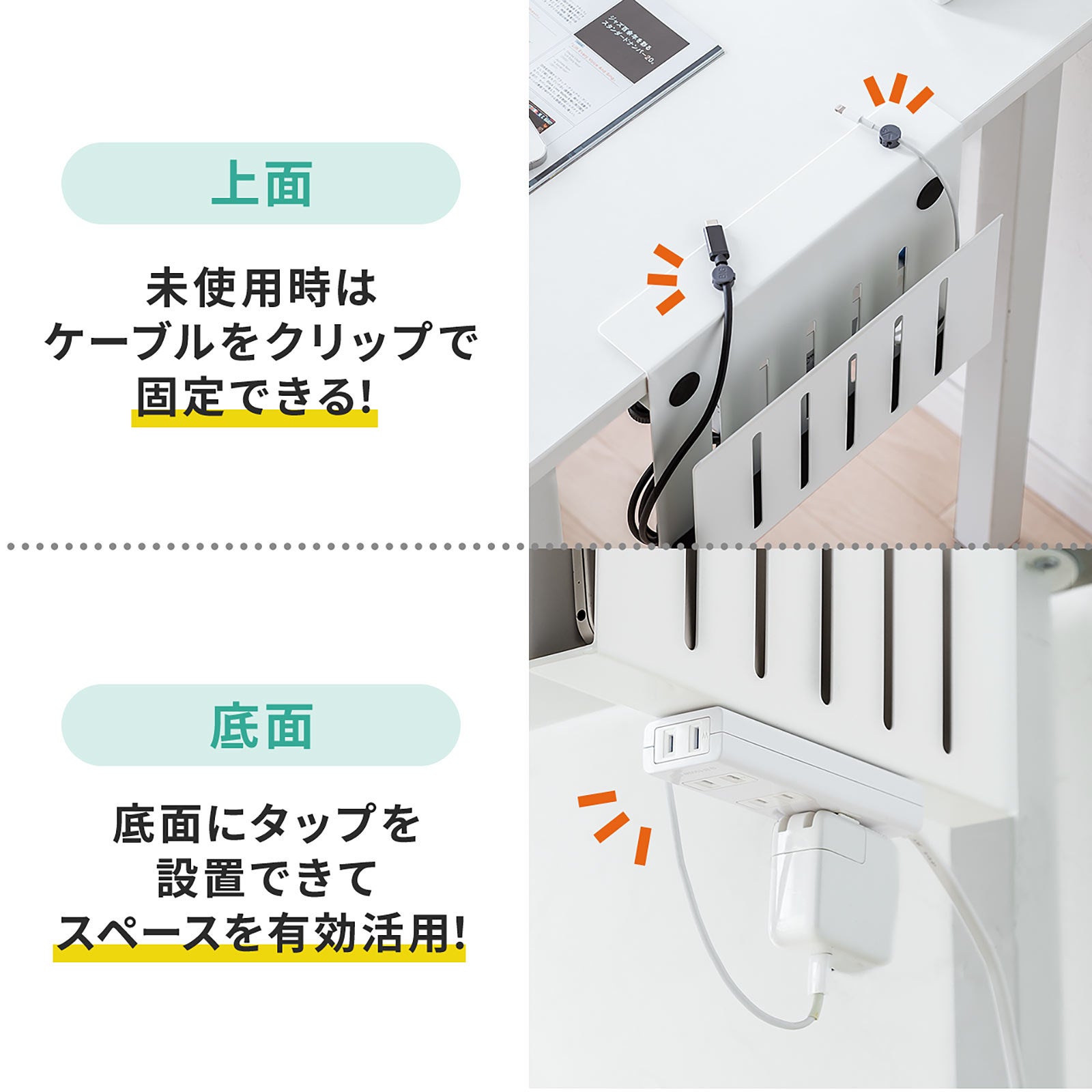 マグネット付きのケーブルホルダーやUSBハブなどを固定できるスチール製です。
