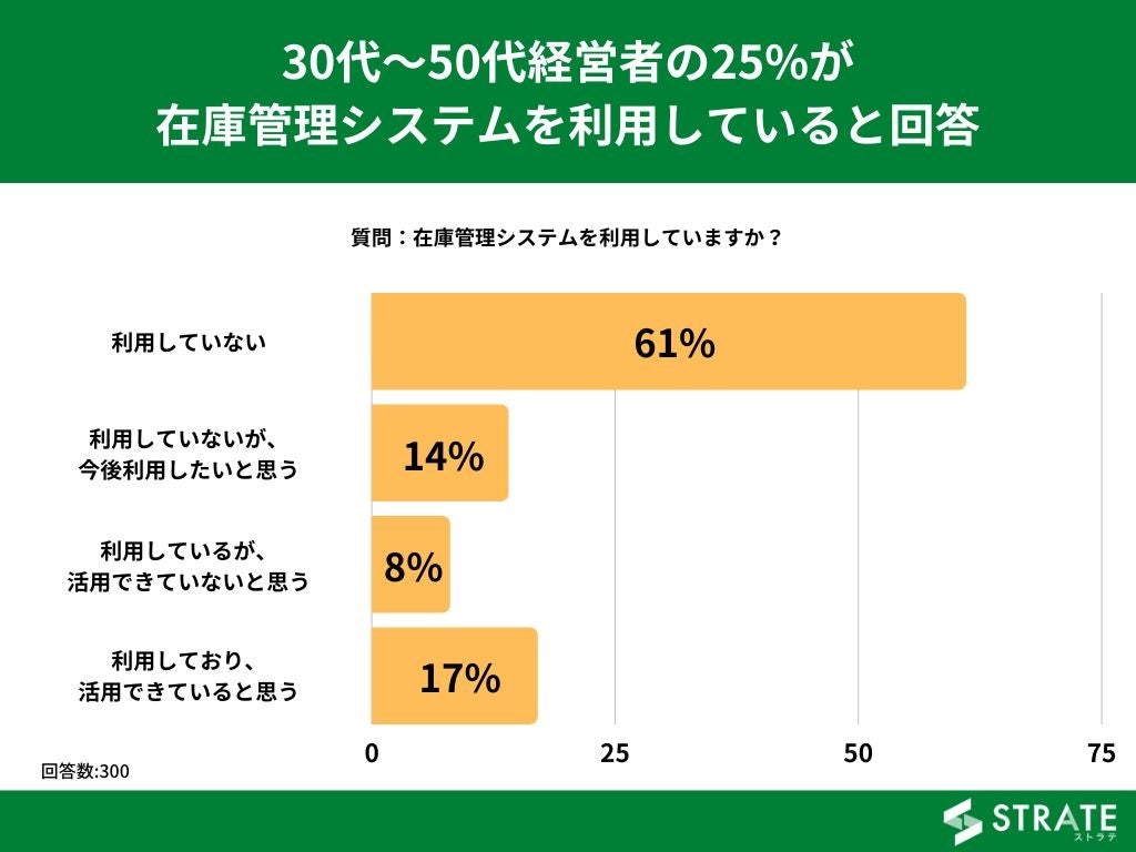 30代~50代の男女を対象とした「在庫管理システムを利用していますか?」というアンケートで最も多かった回答は「利用していない」で61%でした。