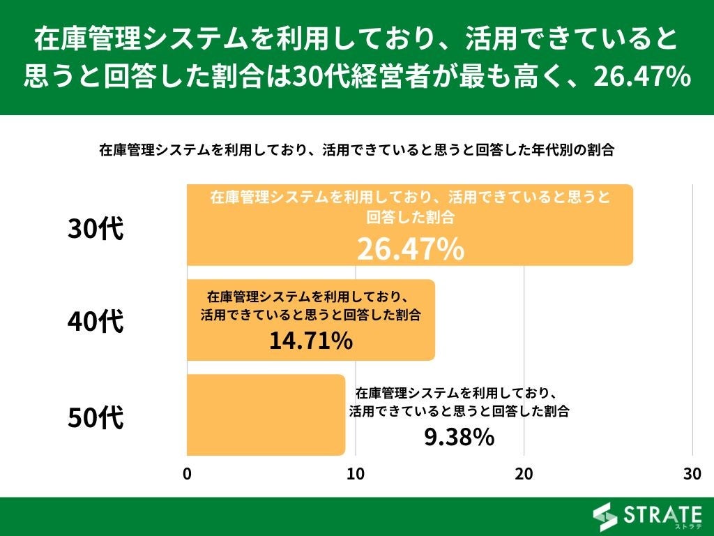 【在庫管理システムを利用しており、活用できていると思うと回答した割合は30代経営者が最も高く、26.47%】