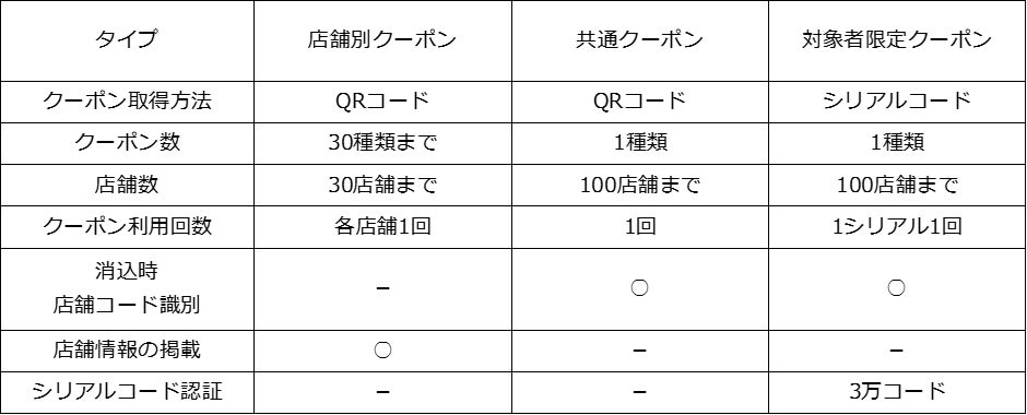全タイプ共通搭載機能:クーポンもぎり機能/お知らせ機能/参加同意画面/参加時属性アンケート/規約ページ/店舗リスト/デザイン入替(ヘッダー・クーポン)