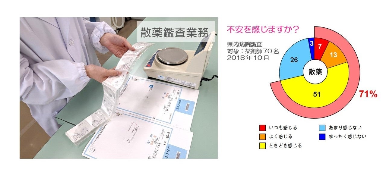 このように、薬剤師の対物業務の機械化、DX化が進んでいる現状ですが、一包化散薬の調剤鑑査についてはこれまで機械化されておらず、薬剤師の目視頼りで行われているのが現状です。これは、散薬は外観が類似した白色の粉末が多いため、画像解析などの機械化技術が適用できないためです。ただし、散薬を投与される患者さんは小児や高齢者が多く、薬剤の取り違えは大きな医療事故につながるおそれがあります。そのため、薬剤師は一包化散薬鑑査業務には心理的な圧力を感じています。また、鑑査時に複数人の薬剤師でダブルチェック、トリプルチェックが行われるため、業務内での時間的圧力も少なくありません。
