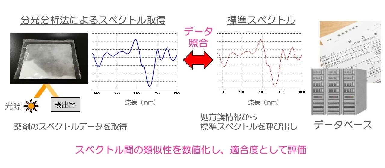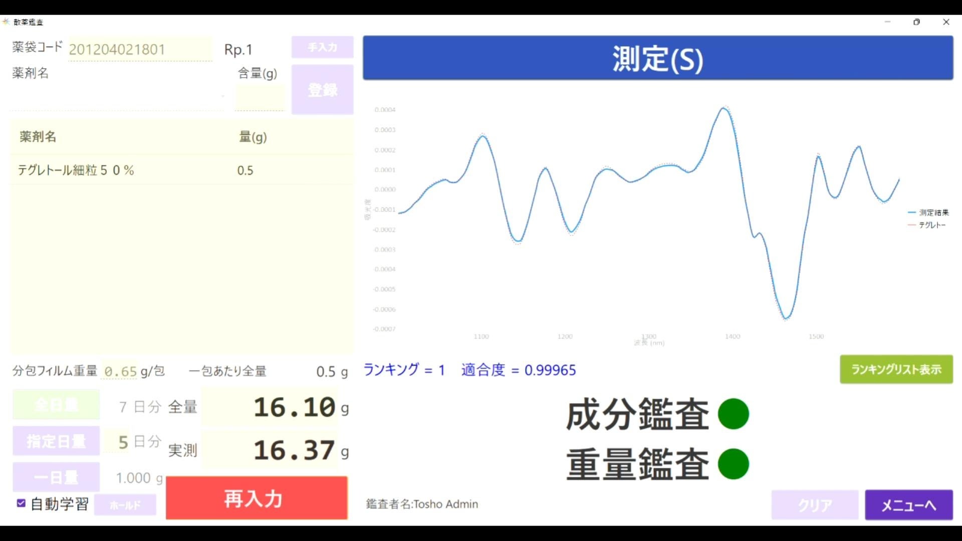 「コナミルPLUS」は、一包化散薬に近赤外線(*1)を照射し、その吸収スペクトル(*2)をデータベース照合することにより薬剤を識別する機能を搭載しています。これにより、調剤した一包化散薬が処方箋に記載しているものと相違ないか、自動で判断することができます(成分鑑査機能)。二剤以上が混合された散薬についても、含まれる散薬の種類と混合比を確認することができます。