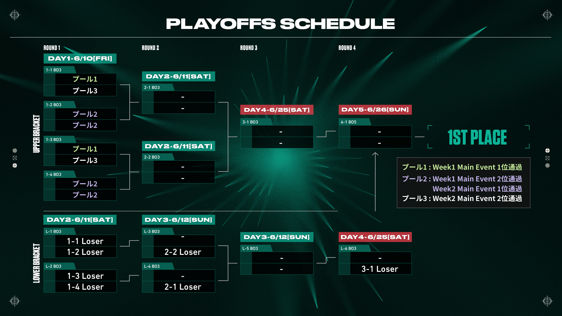 当初、6月16日(木)〜6月19日(日)の4日間で開催を予定しておりましたPlayoffsの日程が下記へと変更となりました。
