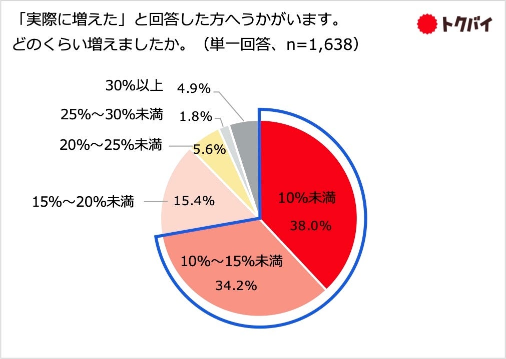 「実際に増えた」と回答している方へ支出がどれくらい増えたかをたずねたところ、「10%未満」との回答が38.0%で最多となり、次いで「10〜15%未満」が34.2%となりました。