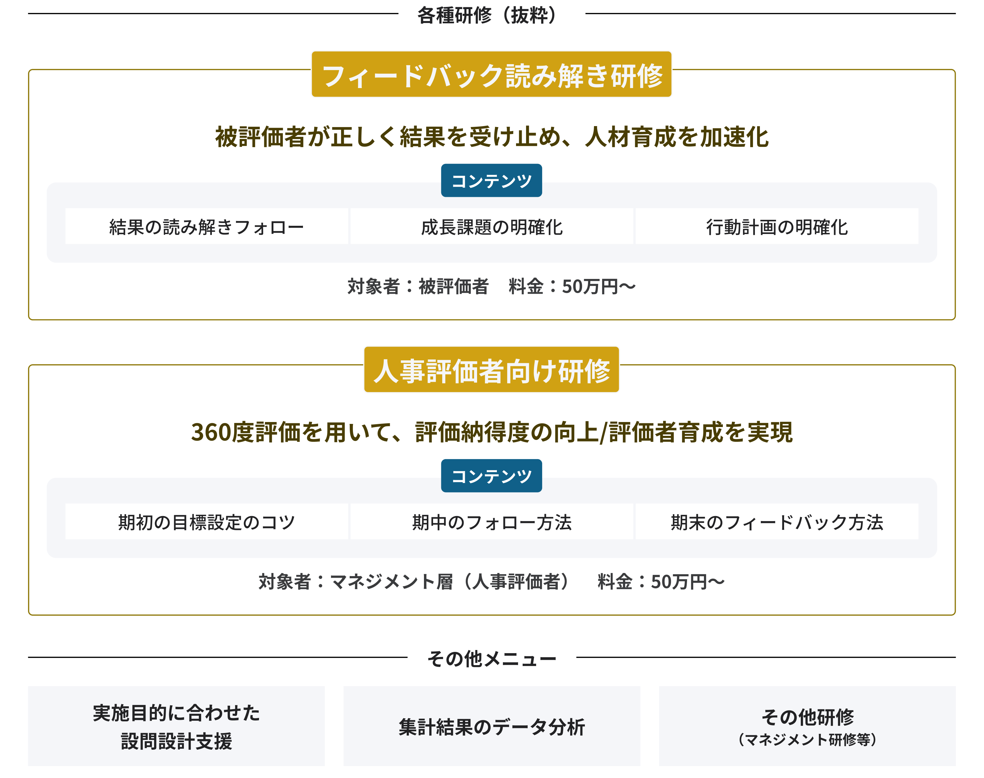 実施目的や貴社のご状況に合わせて、設問設計からデータ分析までを一気通貫で支援するコンサルティングから、人材育成を加速させる「フィードバック読み解き研修」など、スポットでの研修も支援可能です。