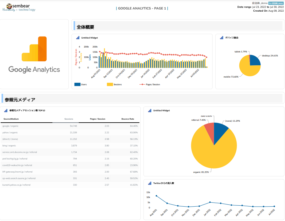 Google Analyticsのダッシュボードでは閲覧されているページや来訪元など、一般的なアクセス解析で取得されるデータを中心に、自治体で必要とされる指標を抽出したダッシュボードを構築しています。