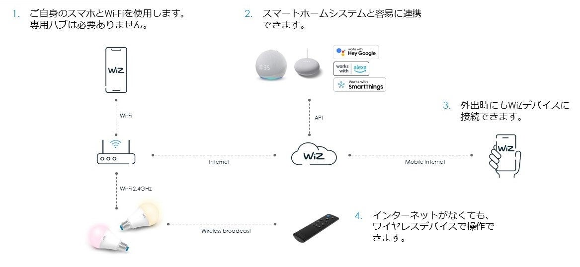 専用アプリとWi-Fiがあれば使用可能なため、専用ハブも不要です。さらにWiZアプリは、メールアドレスや電話番号などの個人情報を取得せず、プライバシーの観点からも安心してご利用いただけます。