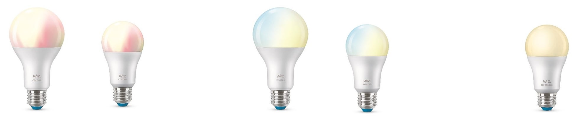 電球タイプでは、「WiZ マルチカラー E26電球」「WiZ 昼光色・電球色 E26電球」から60W相当・100W相当の各2種類ずつ、「WiZ 電球色 E26電球」60W相当の1種の計5種が登場します。1600万色から調色が可能なマルチカラーや白色の調色・調光など生活シーンに合わせご利用いただけます。