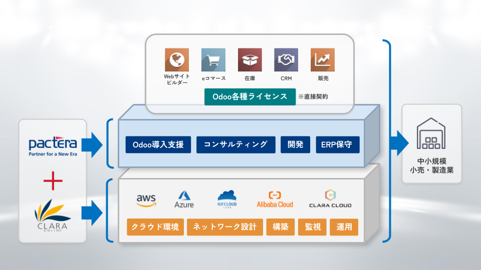 この業務提携により、クラウドインフラ領域のプロフェッショナルであるクララオンラインが、パクテラがお客様にご提供するOdooの基盤となるAWS、Azure等のIaaS構築・運用を提供します。