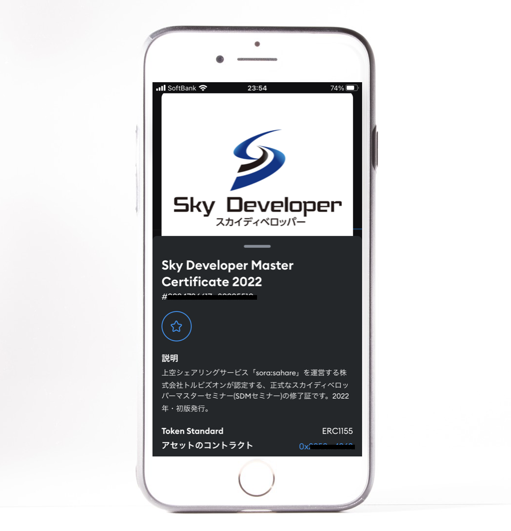 このたび、トルビズオンが発行するNFT第1弾として、スカイディベロッパーマスターセミナーの正規卒業生の資格をデジタル化したNFT証明書を作成しました。具体的にはスカイディベロッパーとして2022年6月より活動を始める、スカイセッター株式会社(京都府長岡京市、代表取締役:田中 達哉)とそのパートナーに第一号を発行しました。他にもセミナー卒業生等の有資格者に順次発行していきます。入手したNFTはスマートフォンなどで提示することもでき、スカイディベロッパー業務で必要な各種証明等に役立てていただきます。