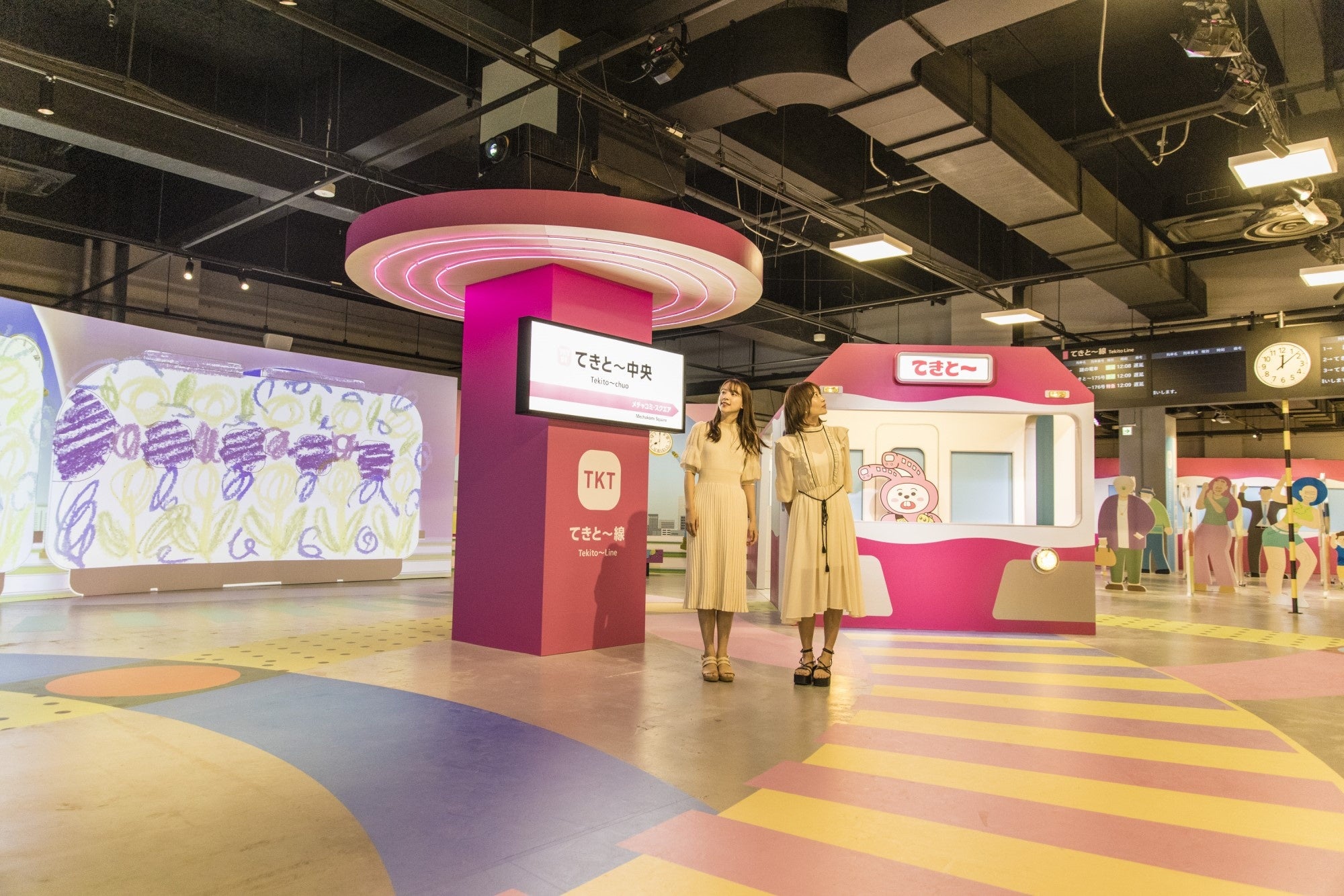 本物さながらにデザインされた券売機でチケットを購入し改札を通ると、そこには、“てきと〜”を満喫できる約1,000m²もの敷地が広がっています。来場者は、全⻑約42.5mにもなる「てきと〜線」というぐにゃぐにゃの車両に乗り、「てきと〜中央駅」、「エキベン・タウン駅」、「メチャコミ・スクエア駅」、「てつど〜ぶつパーク駅」、「ゲーム・ステーション駅」などの各ポイントで下車しながら、様々な体験コンテンツを楽しむことができます。公式サイト(https://www.tekito-train.com/)ではチケットの販売を行っています。