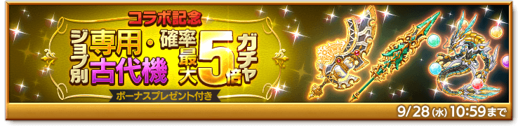 期間中、「ジョブ別 コラボ記念 専用・古代機確率最大5倍ガチャ」を販売します。