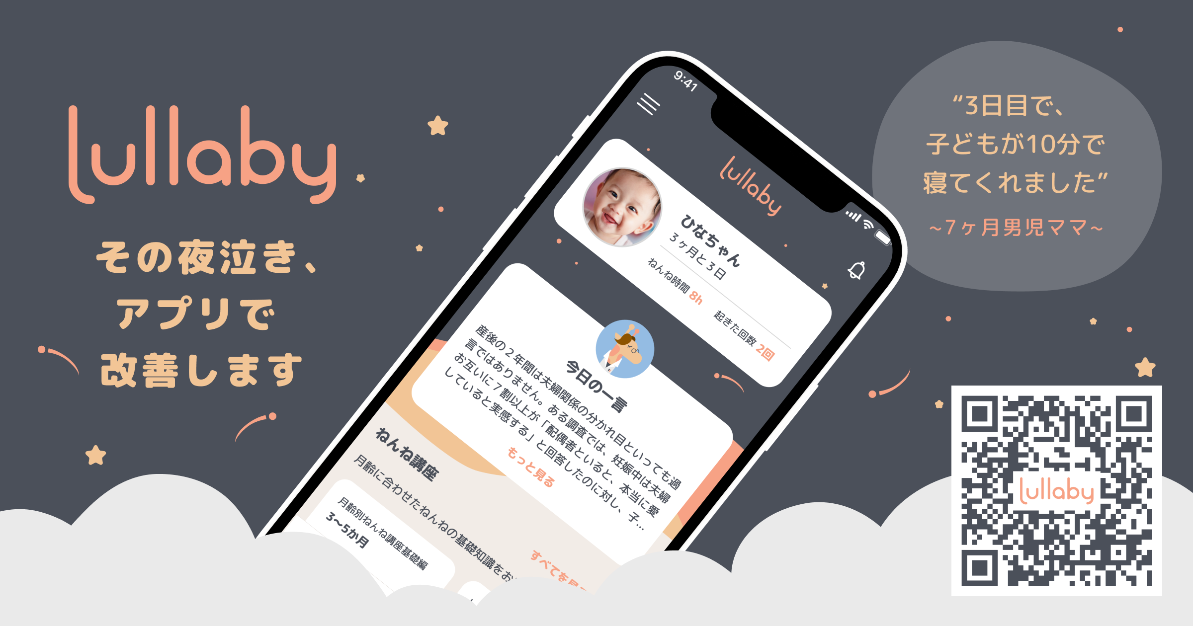 Lullabyは乳幼児の夜泣き・寝かしつけに悩むママ・パパを包括的にサポートする 3 つのサービスが備わったアプリサービスです。3 児の母で東大医学部卒・医師の森田麻里子氏を監修医として迎え、科学的根拠に基づいたデータの使用に拘り、更に日本の住環境・生活に合った情報提供を最重要視することで、忙しいママ・パパでもすぐに活用できるアプリとなっています。アプリのインストールはQRコードから!